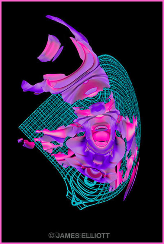 Of all the images to emerge from Elliott's pioneering cyber art masterpieces, 'Nemesis' is one of the most violently powerful. This amazing anthropomorphic image requires viewer concentration. Note the three heads: blind bull, screaming punk pig and the stern leonine visage of power and restraint. The image brilliantly portrays an inner power struggle and conflicts of attitude. The title and the image together suggest that perhaps the only true nemesis, the person you really fight, is yourself.